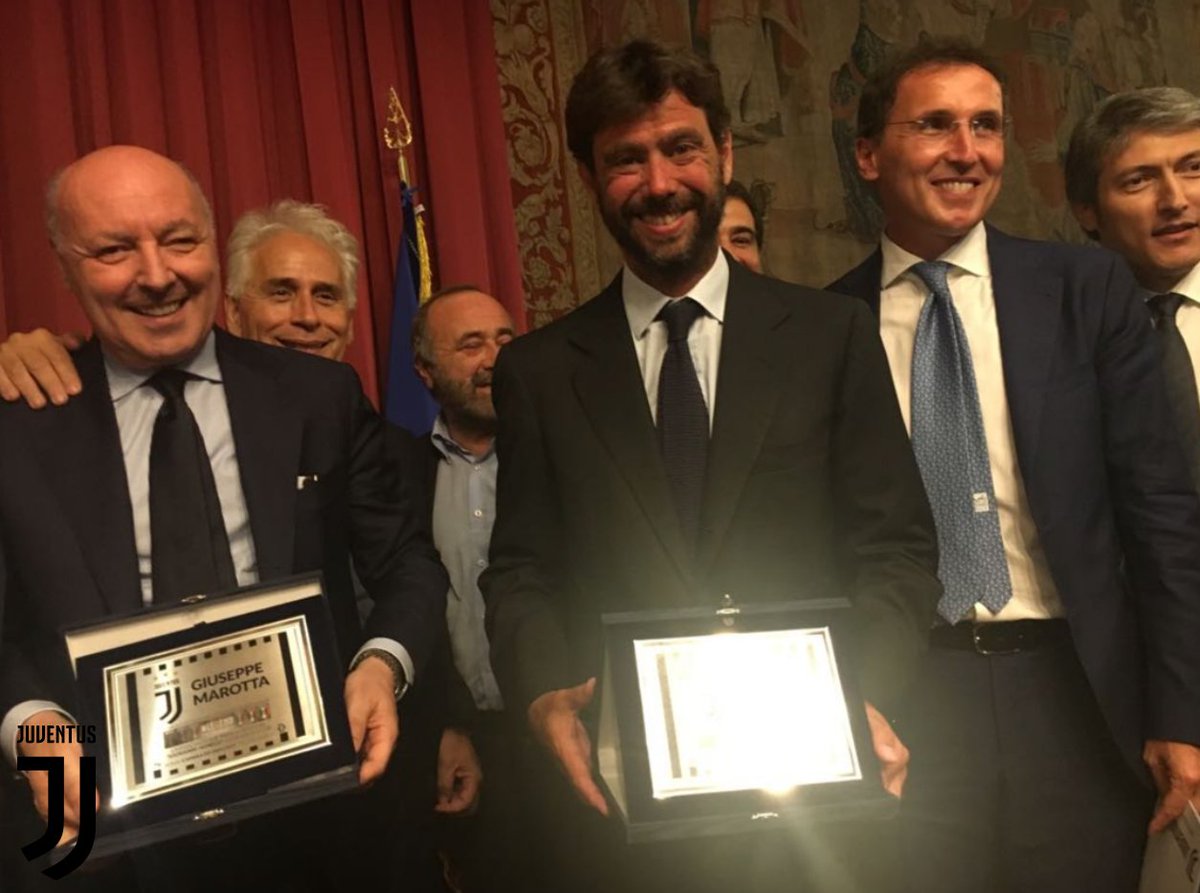 Agnelli i Marotta w Rzymie. Zdjęcie świeżutkie. Sprzed chwili. Na rozdaniu jakichś nagród imienia Giovanniego Agnelliego. Bawią się